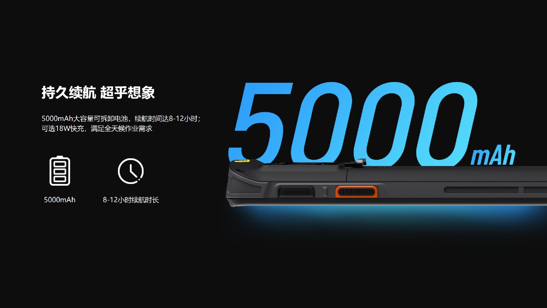 5000mAh大容量可拆卸電池,續(xù)航時間達(dá)8-12小小時;可選18W快充,滿足全天候作業(yè)需求